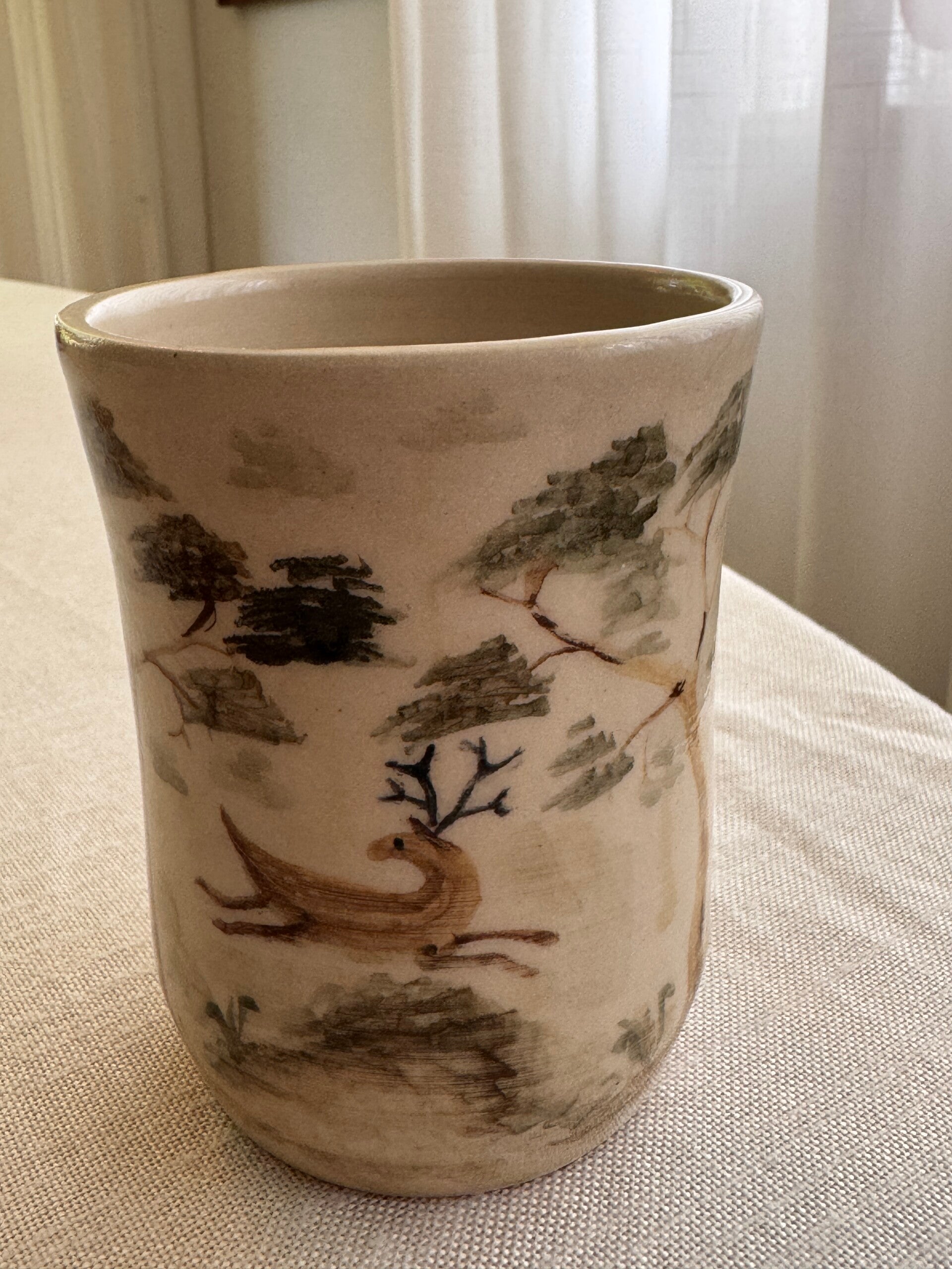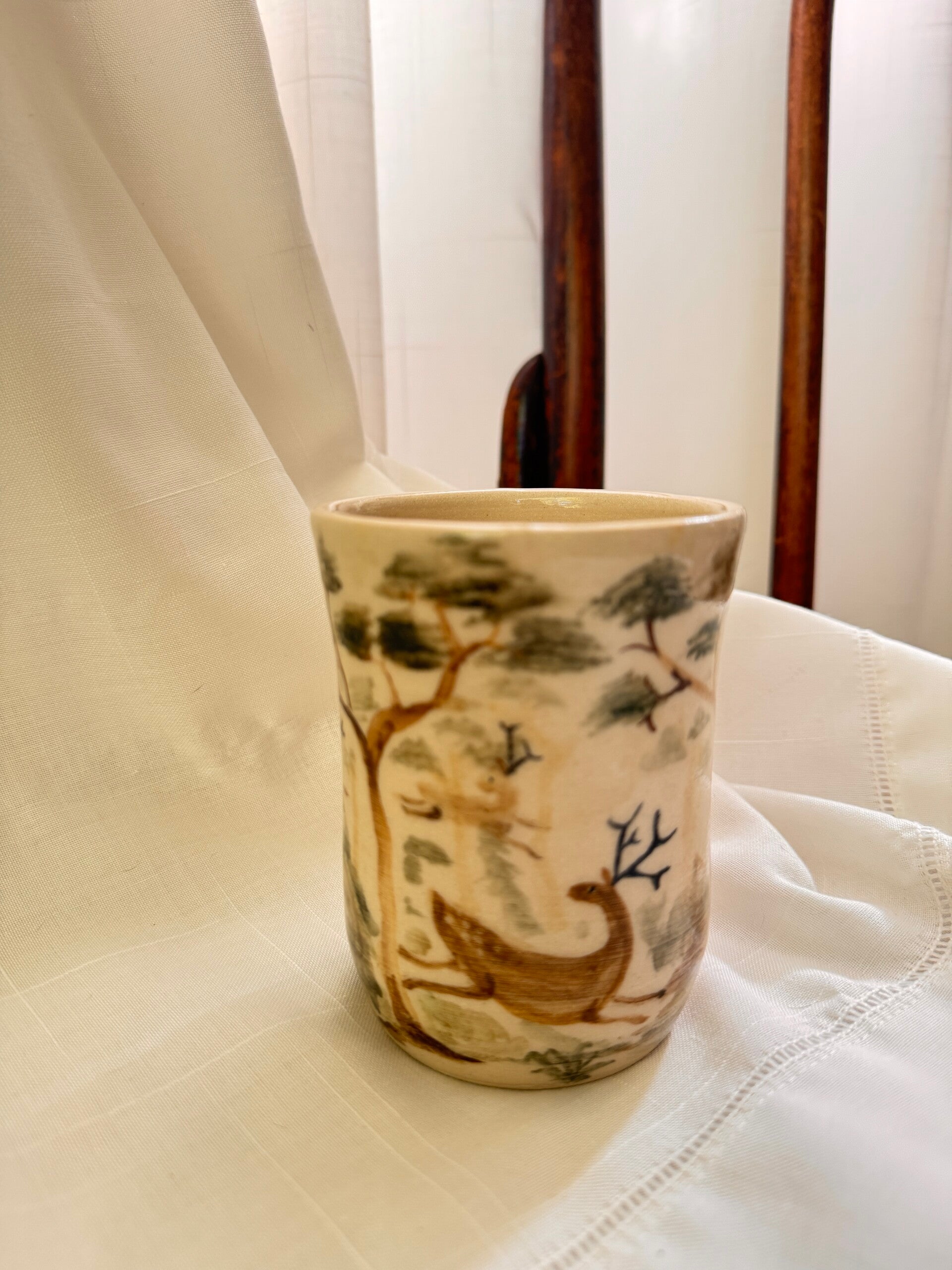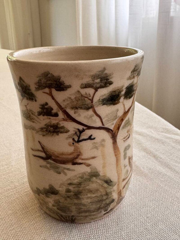 Dit unieke keramieken vaasje is handgedraaid en met de hand beschilderd, waardo Het tafereel van springende herten tussen de grove dennen geeft het vaasje een natuurlijke, bijna sprookjesachtige uitstraling.