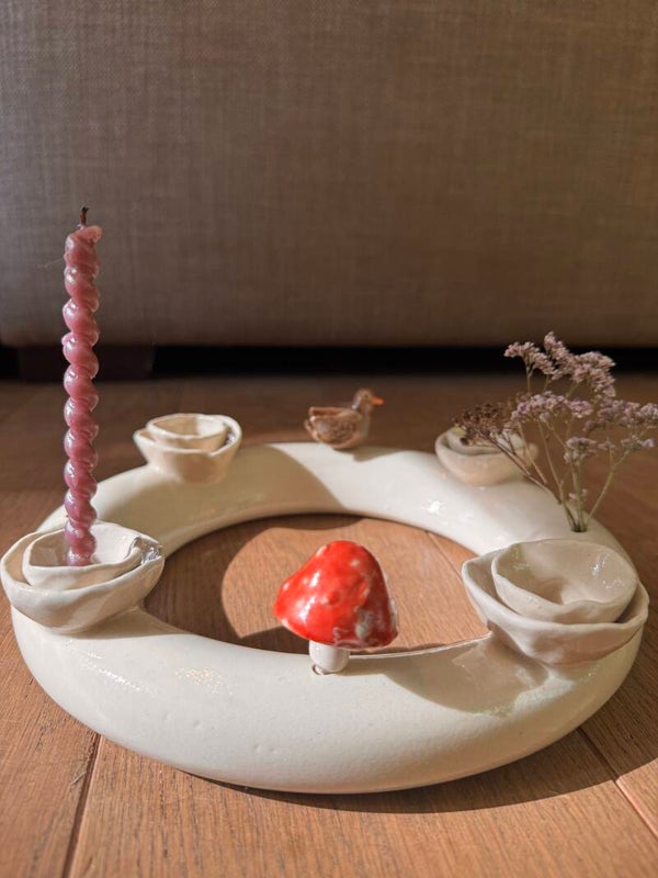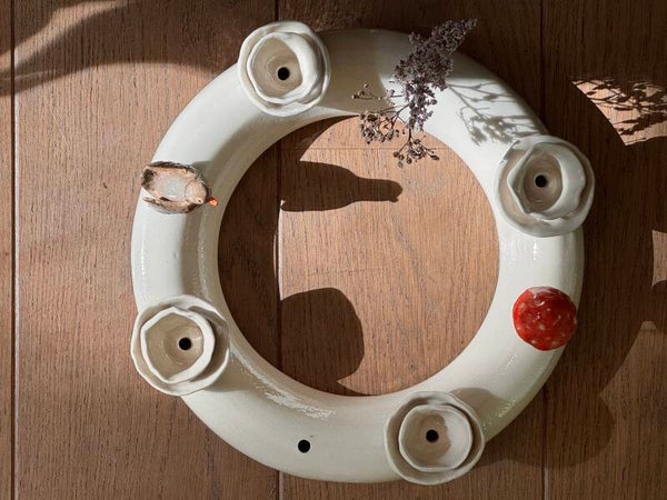 Deze handgemaakte keramieken is een veelzijdig en stijlvol middelpunt voor elke tafel. Perfect als adventring met plaats voor 4 kaarsen, maar ook prachtig het hele jaar door te decoreren met de (los verkrijgbare) stekers of kleine bloemen.